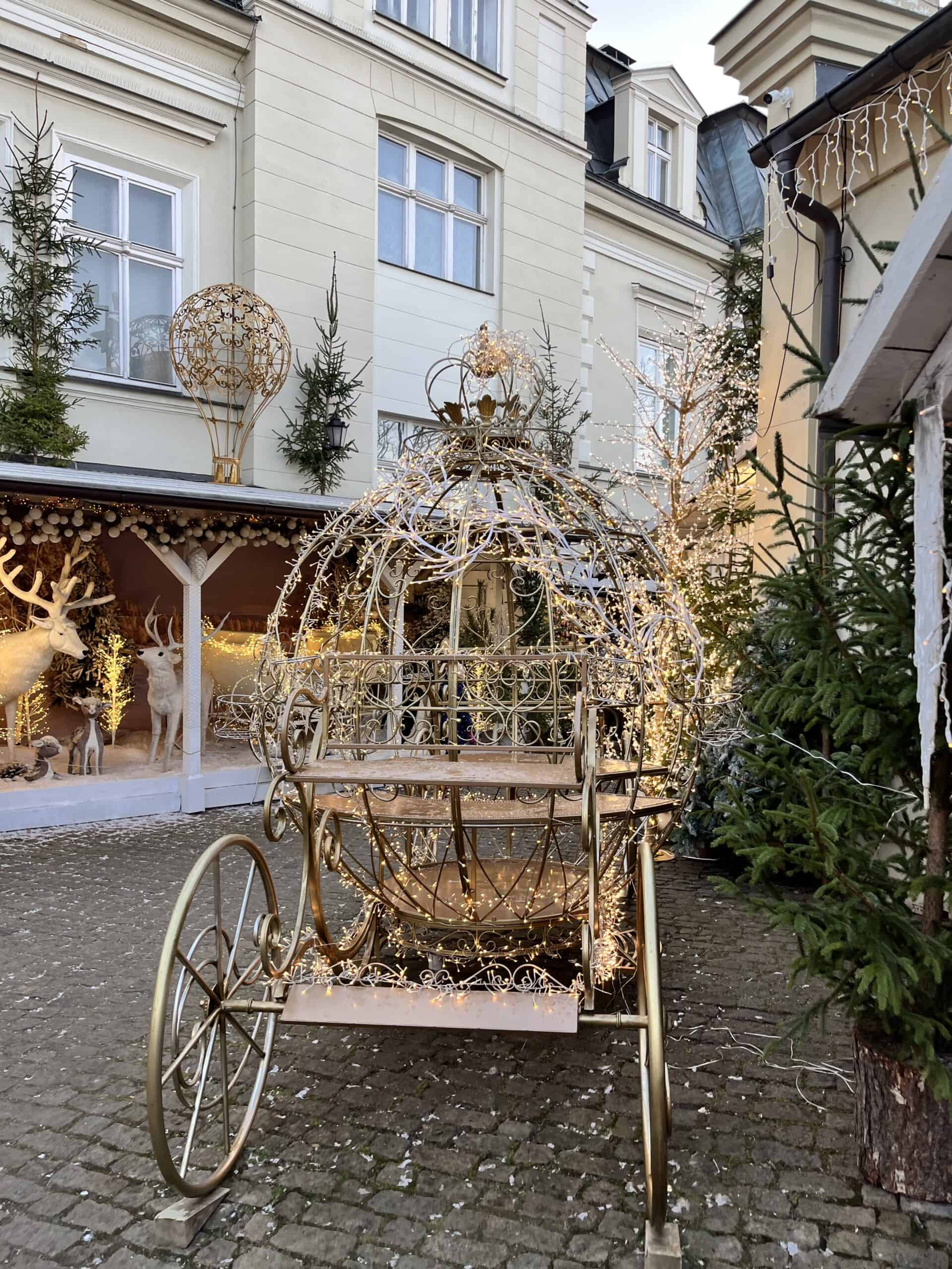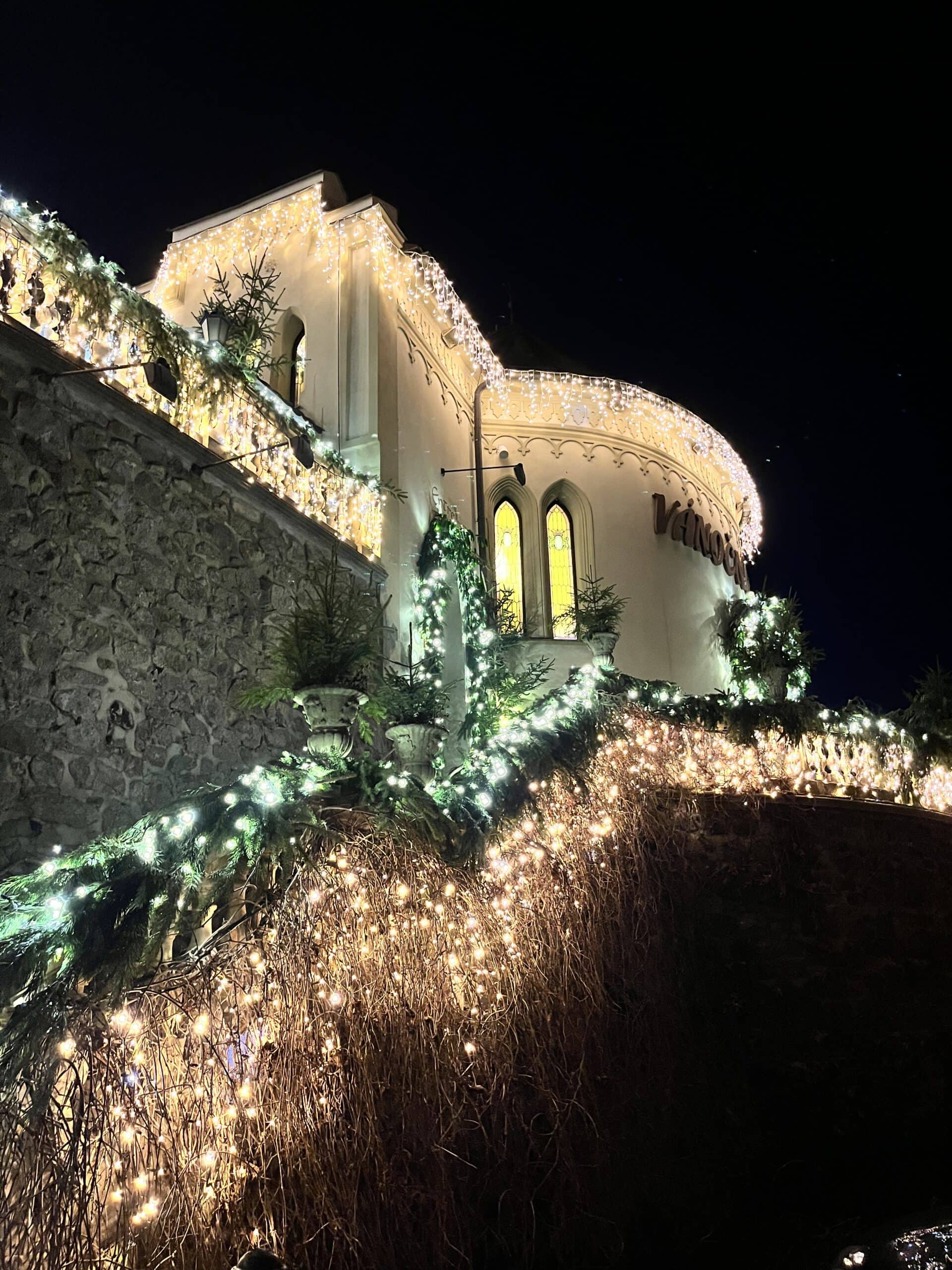 Venkovní část je vyzdobená světelnými dekoracemi do nichž se dá vstupovat a pořizovat fotky. K dispozici vám je popelčin kočár, vánoční vlak a také pohyblivé instalace se zvířaty.