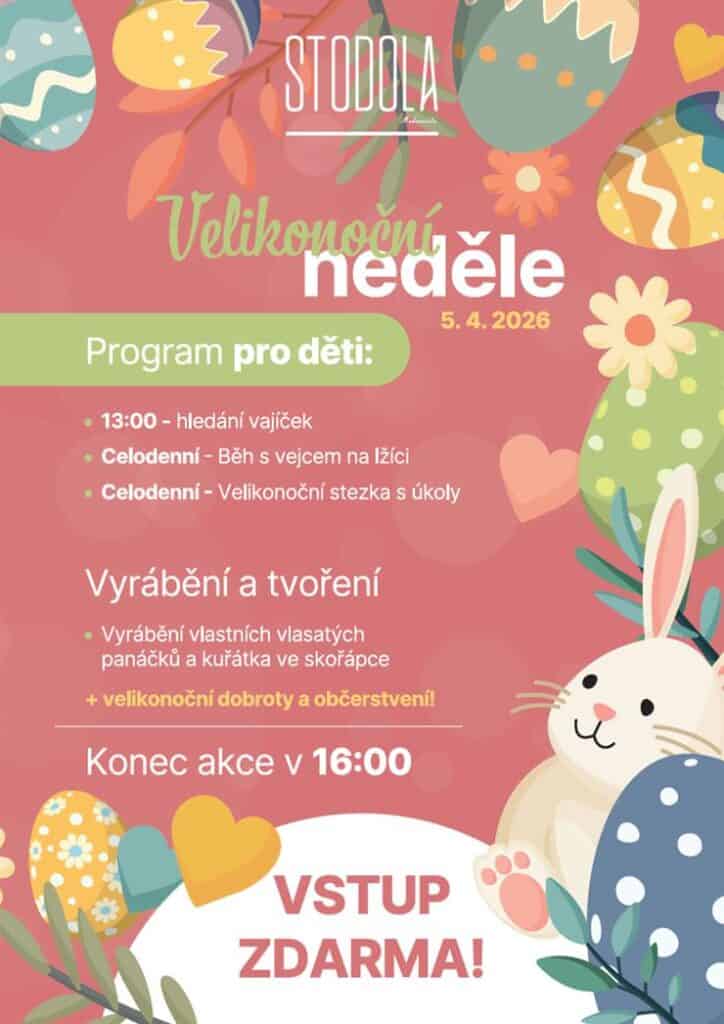 Velikonoční neděle ve Stodole je komorní velikonoční odpoledne pro děti i rodiče. Na místě čeká velikonoční stezka s úkoly, vyrábění a tvoření a také drobné velikonoční dobroty. Je to fajn volba pro rodiny, které chtějí kratší sváteční program v příjemném komunitním prostoru. Program začíná ve 13:00 a probíhá ve Viničním domku. Vstup zdarma.