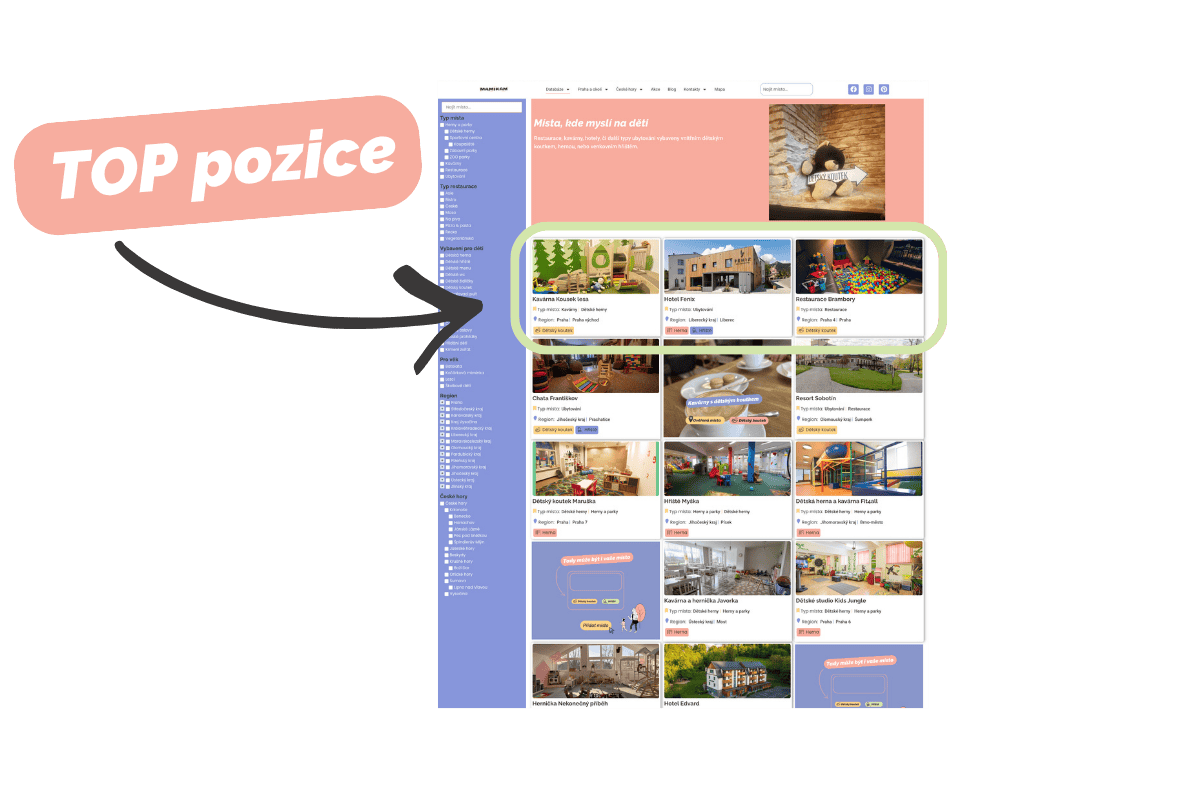 Chcete být mezi prvními místy, která rodiče na Mamikam uvidí ve chvíli, kdy si vybírají, kam vyrazit? TOP pozice vás dostane na začátek výpisu, dnes více než 400 míst, kde máte největší šanci zaujmout a získat nové zákazníky.