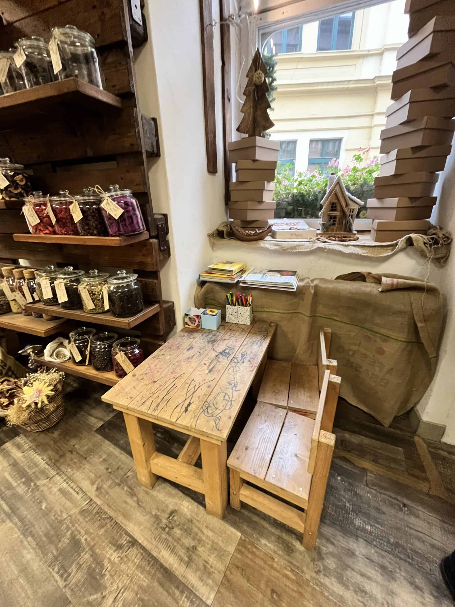 Budete-li si chtít nápoj i dobroty vychutnat na místě nebo jen v klidu vybírat z nepřeberného množství oříšků, vaše děti si mohou v klidu malovat u stolečku.