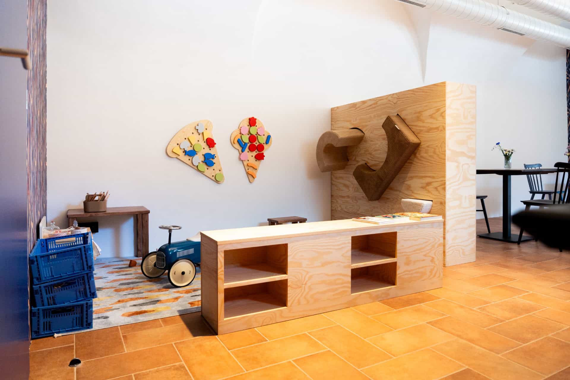 Koutek je umístěn až na konci prostoru kavárny. Sice není celý ohraničený, ale i kdyby vám prcek vylezl ven, nebude to znamenat pohromu, tam nikomu překážet nebudete.