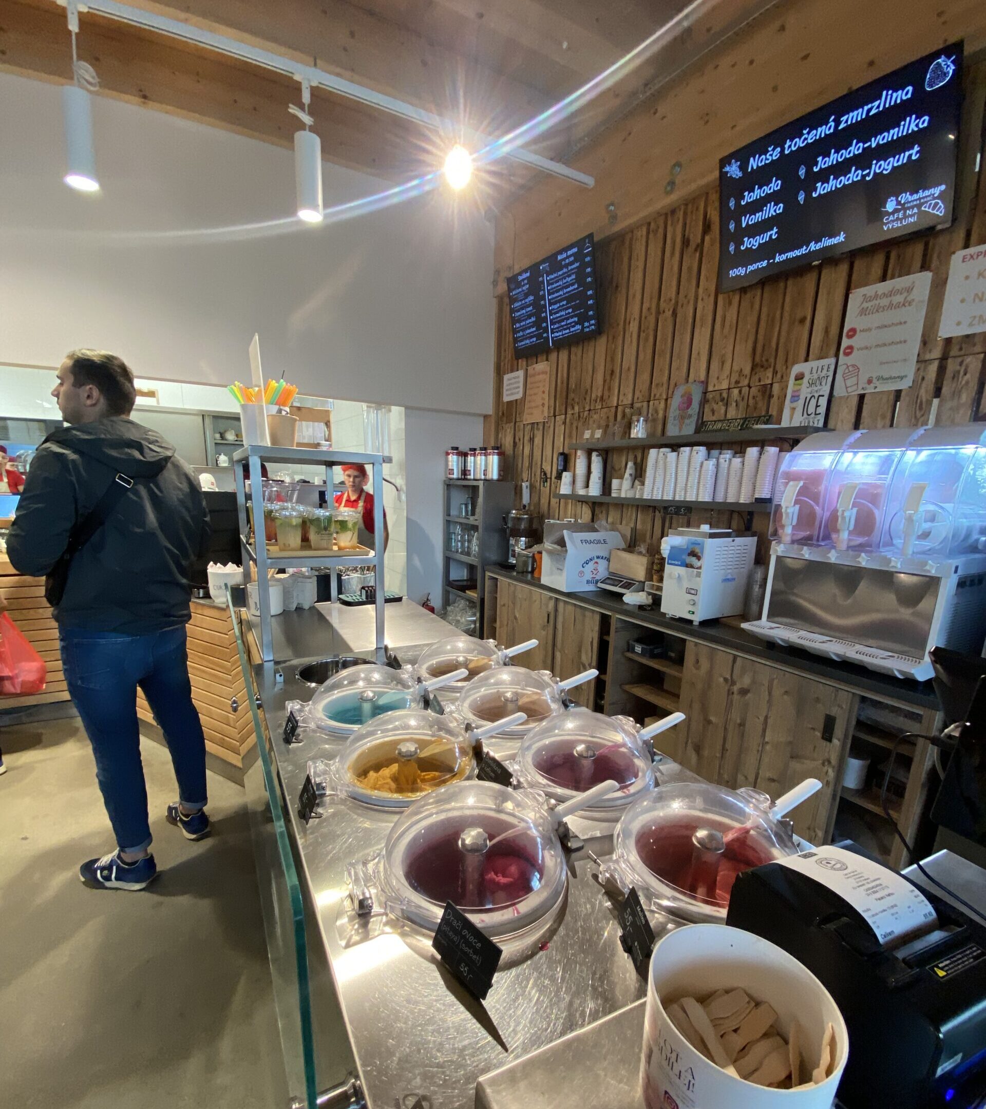 Součástí areálu farmy Vraňany je skvělá kavárna, kde nedělají jen fantastické letní jahodové dezerty, ale můžete si zde dát plnohodnotnou snídani, oběd, díky polednímu menu, tak i v průběhu dne nějakou klasickou minutku. Na děti, ve vnitřní části areálu čeká obří hřiště s prolézačkami, ebo skákacími hrady, kde se často konají i různé akce pro rodiny. Vy si s kafíčkem můžete jít sednout i tam. Posezení mají samozřejmě i vnitřní. Pokud by už nebylo dole místo, výjděte do patra druhého, kde bývá i větší klid. Jídlo se objednává u pultu.
