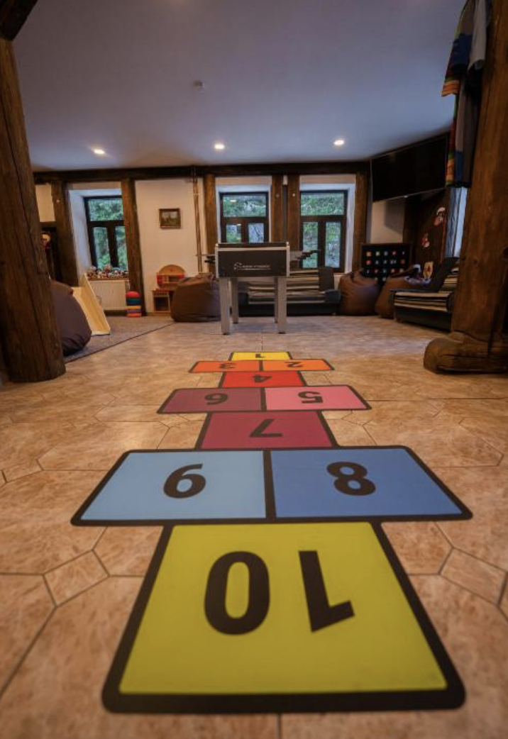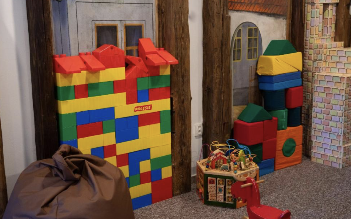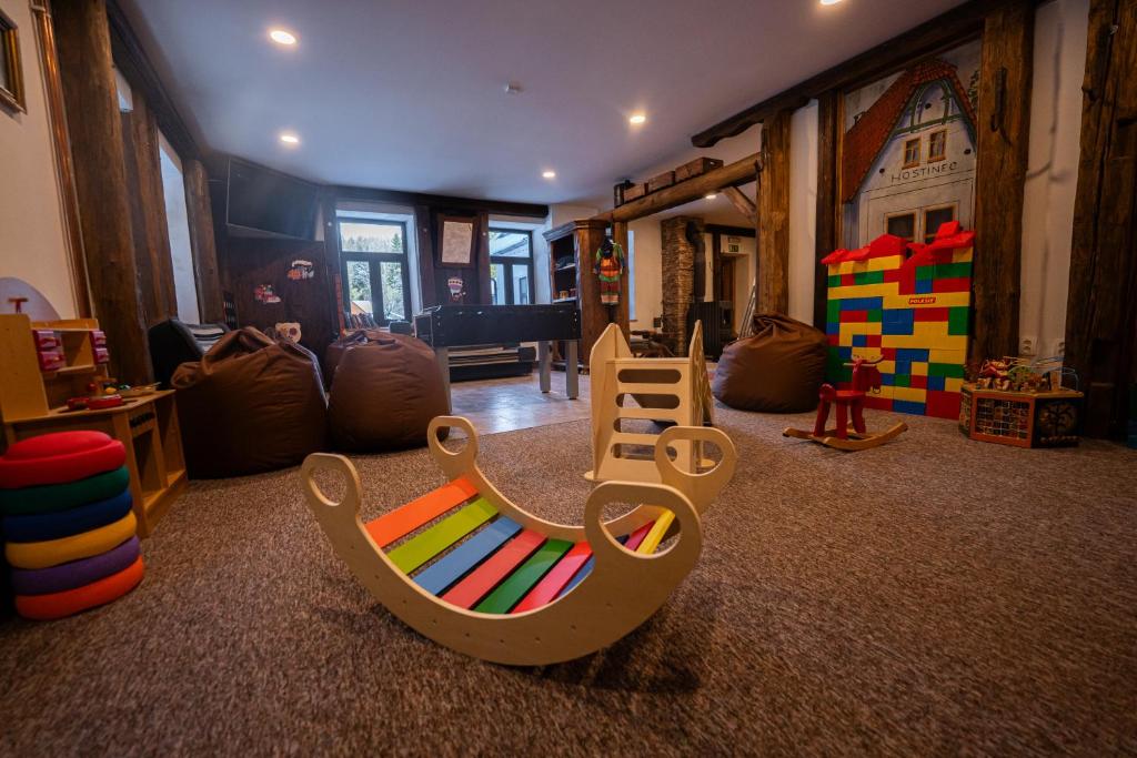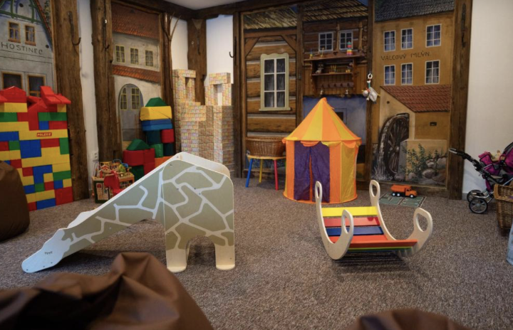 K dispozici vám je vnitřní dětská herna nedaleko prostoru jídelny. Najdete zde prolézačky, domeček, skákacího panáka, dětské knížky a mnoho dalšího.