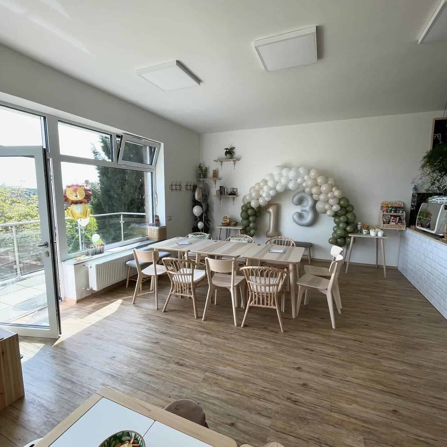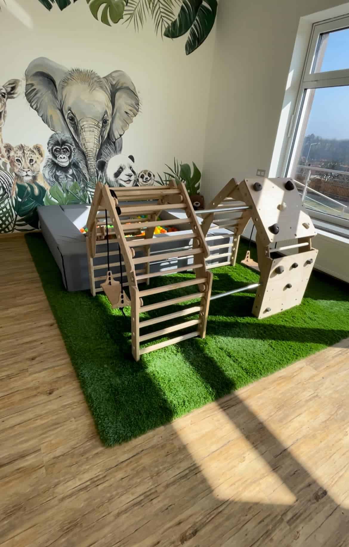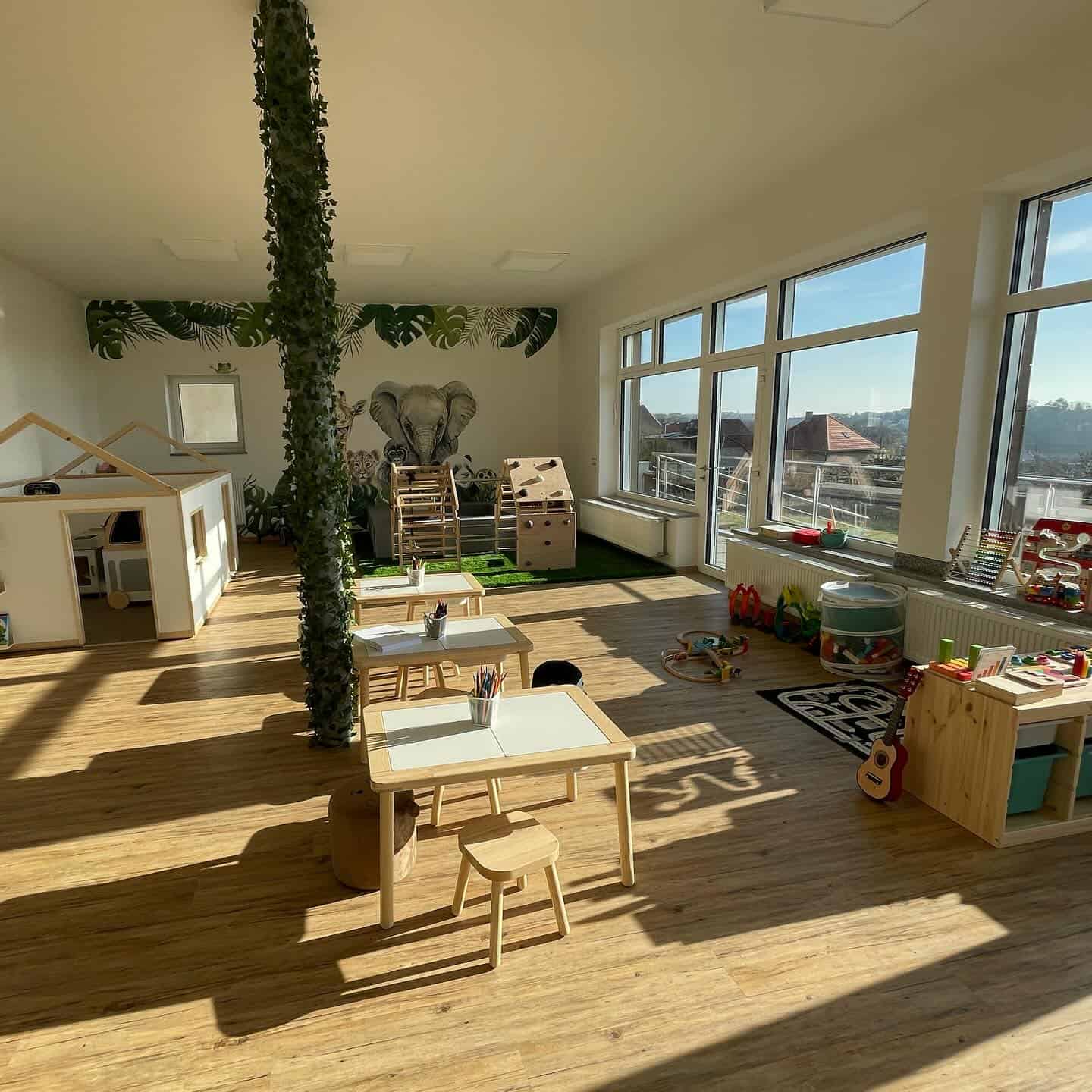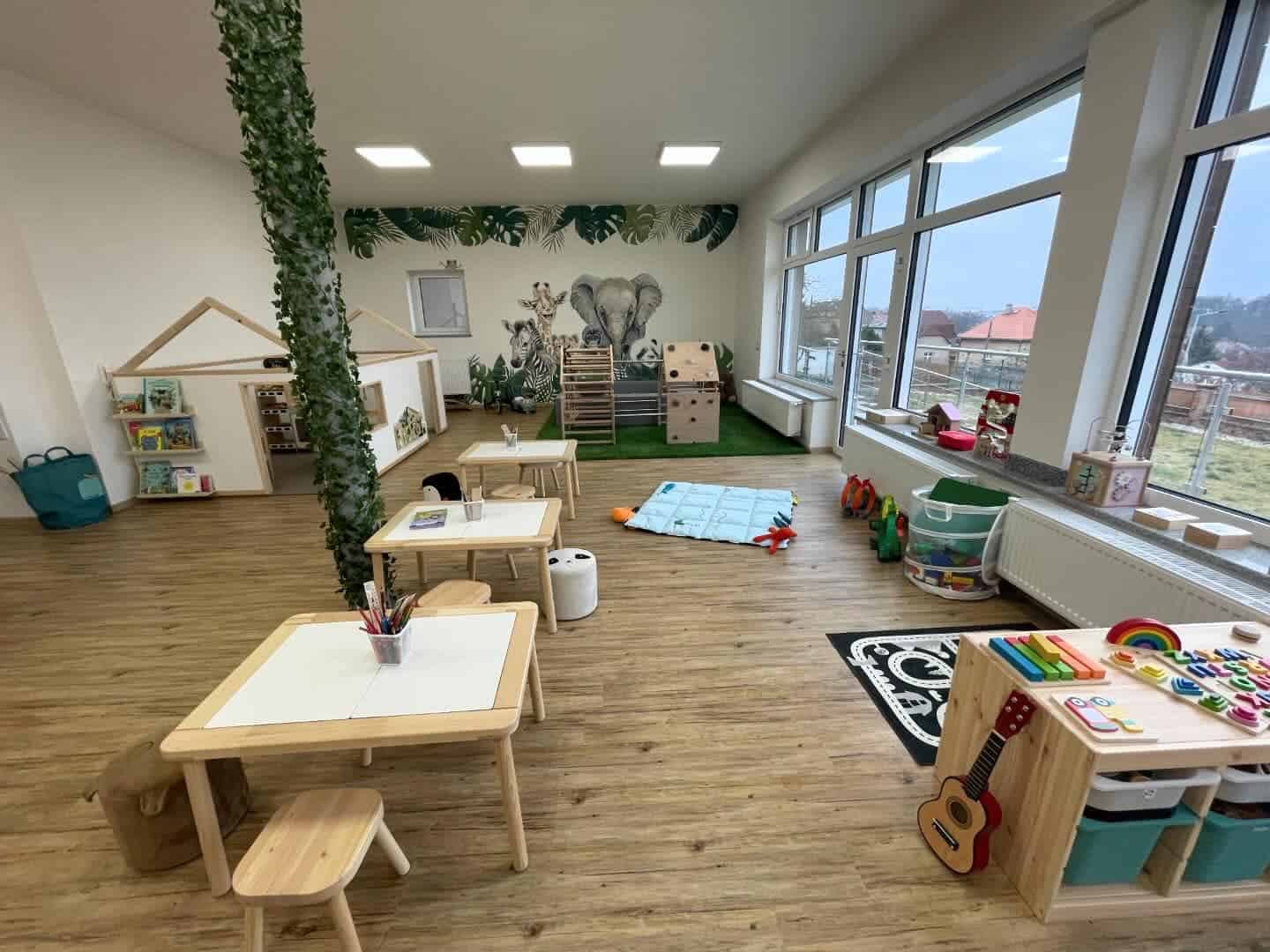 Vnitřní prostor nabízí krásné dřevěné hračky, kuchyňku, systém žebřin či bazének s balónky. K dispozici jsou hračky pro malé i větší děti, Montessori pomůcky nebo stolky na smyslohraní.
