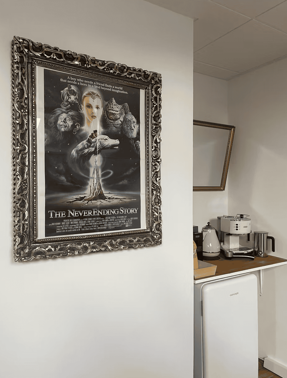 V koutku není kavárna, ale kuchyňský koutek s lednicí, kávovarem a rychlovarnou konvicí.
