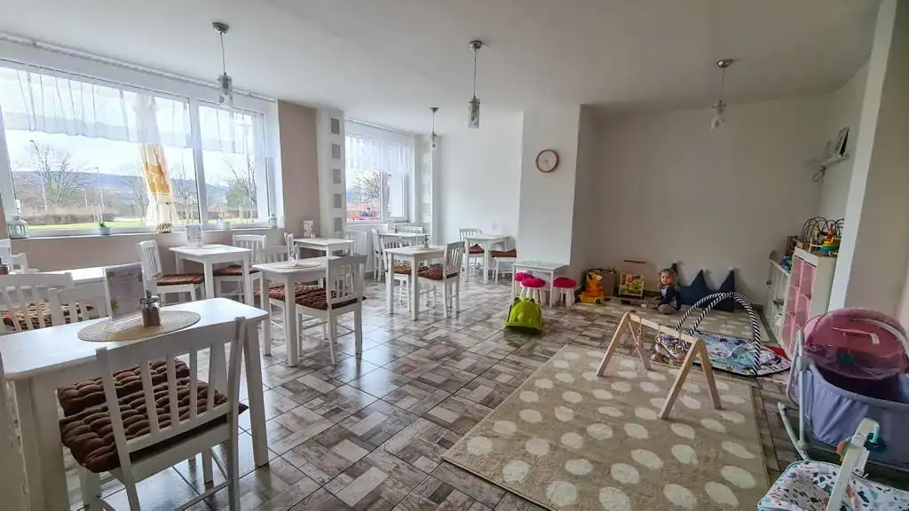 V hezkém prostředí s dřevěným vybavením zaměření Montessori si můžete posedět nad kávou, dětem dopřát dětské kafíčko a společně si dát něco dobrého na zub.