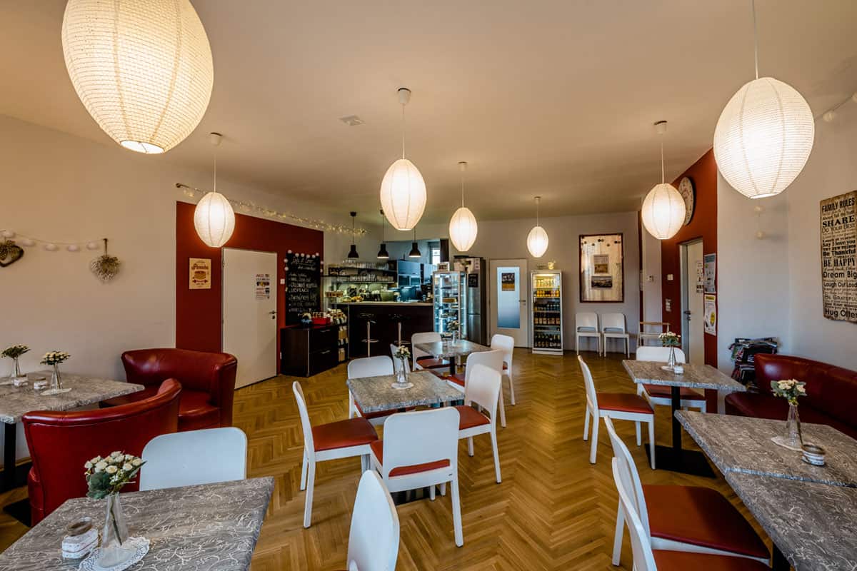 Občerstvení poskytuje široký výběr- palačinky sladké i slané, dorty a zákusky, pizzy nebo obědovou nabídku.