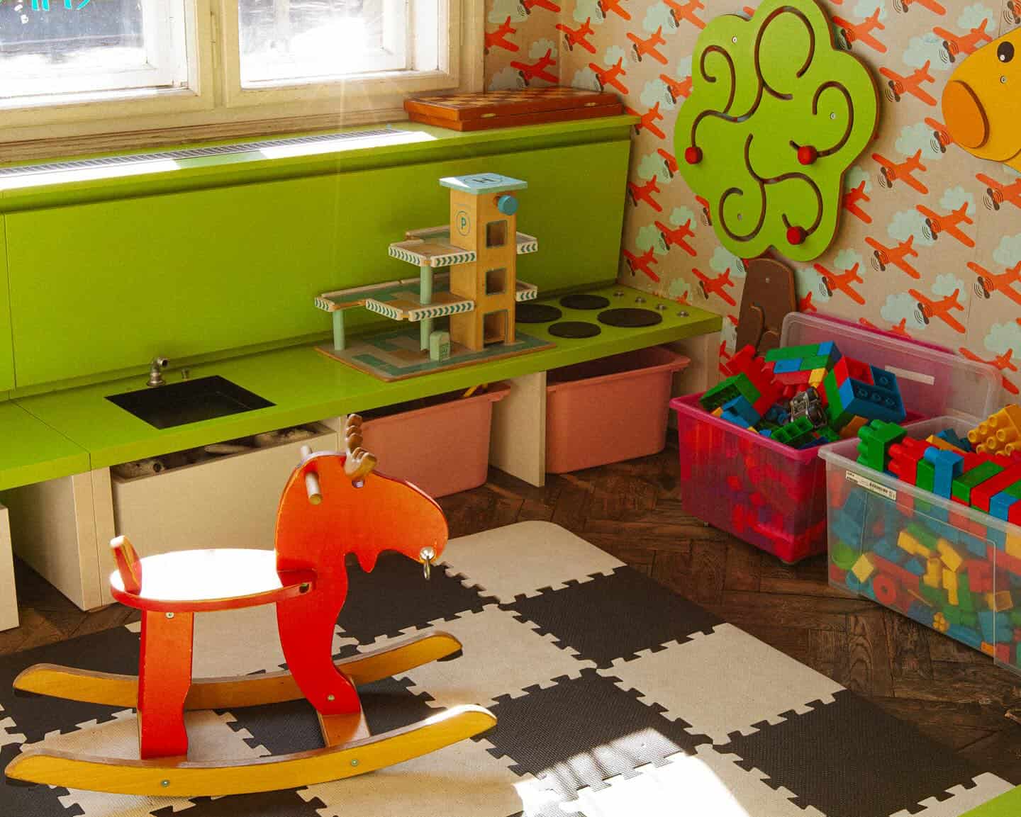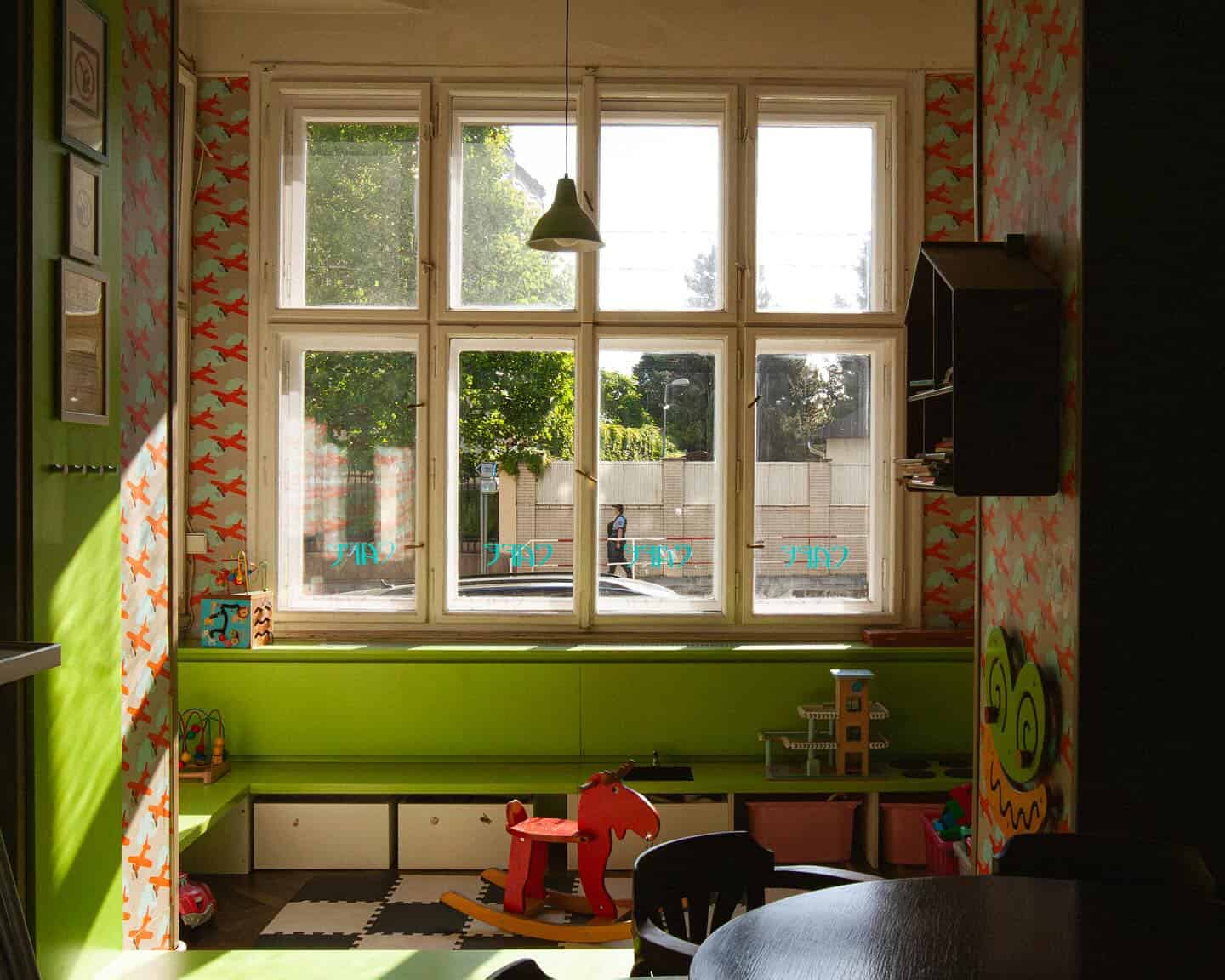 Koutek umístěný ve výklenku přímo v kavárně s možností sedět v jeho blízkosti a sledovat své ratolesti.