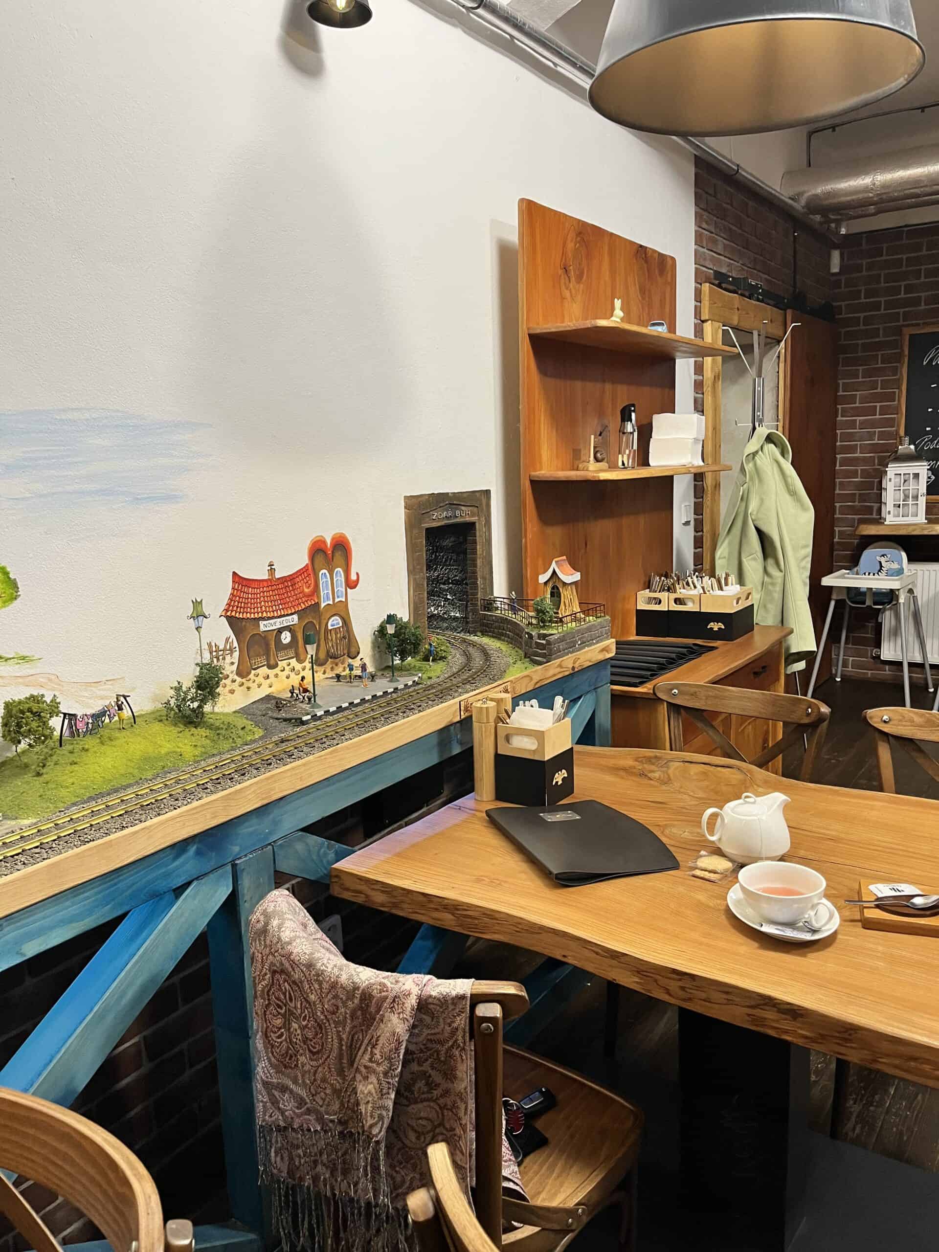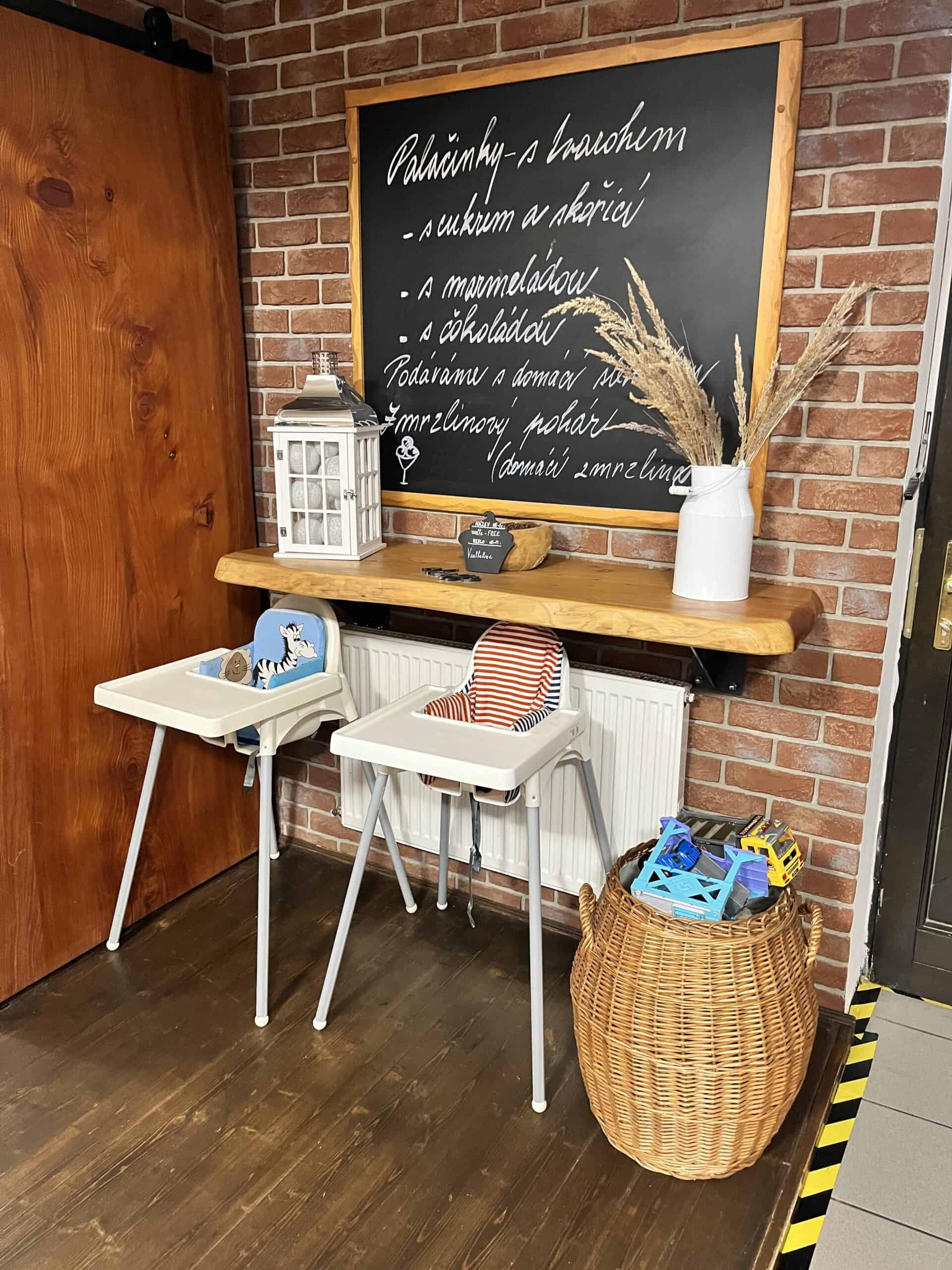 Kavárna nabízí jak vnitřní, tak venkovní posezení. Uvnitř není sice dětský koutek, ale s dětmi se počítá hned dvěma způsoby.