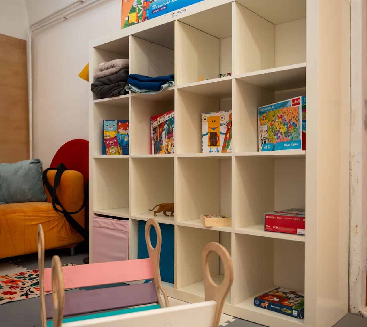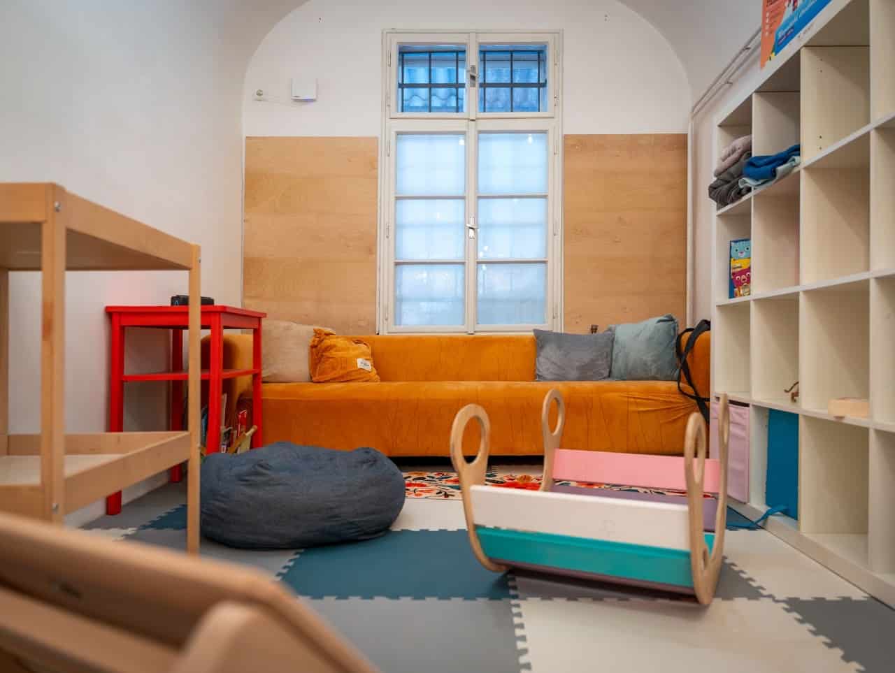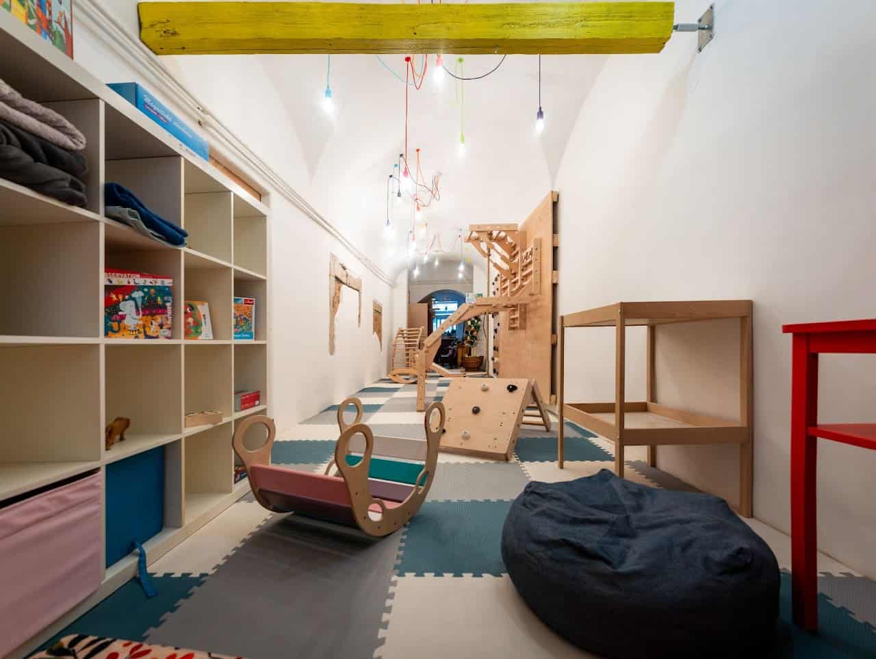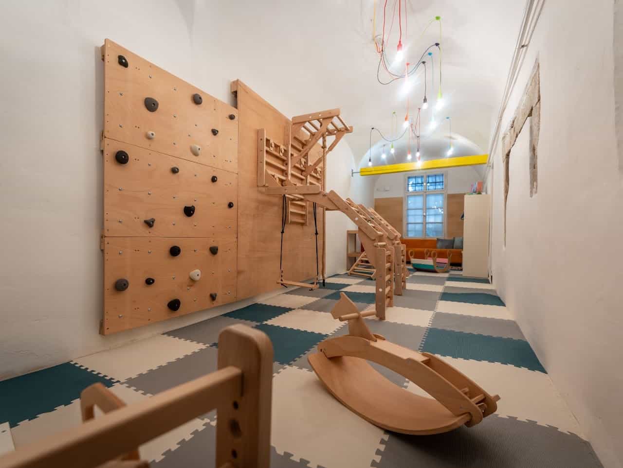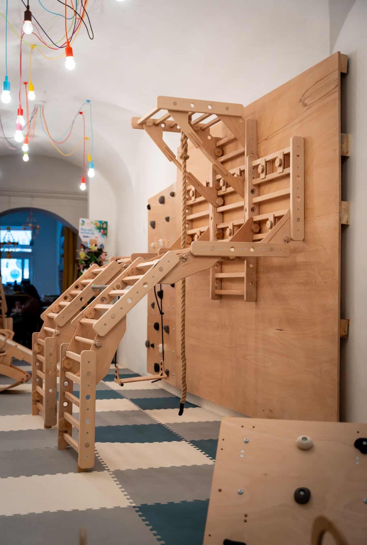 V jeho prostorách je dětský koutek s žebřinami, houpačkami a mnoha dalšími prvky v příjemném dřevěném provedení.