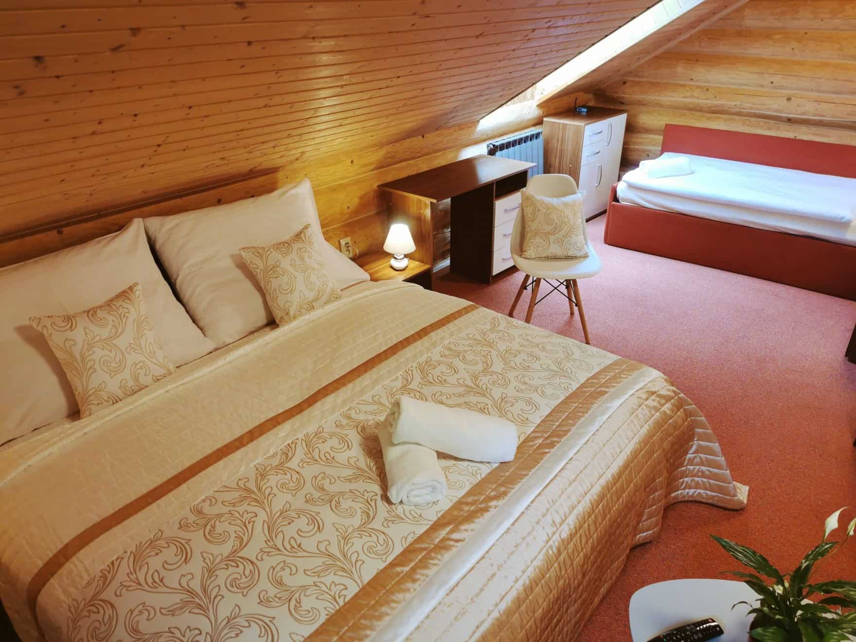 Celý srub je až pro 12 osob. Pro hosty jsou 4 ložnice, každá má svou terasu. Ve srubu jsou také dvě koupelny.