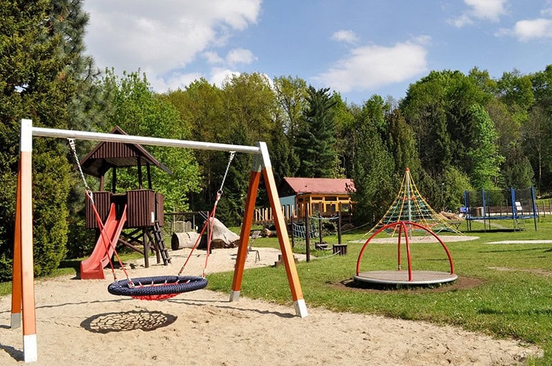 Na zahradě nalezete obří šachy, houpačky, skluzavky, prolézačky ale také bazén či vířivku.