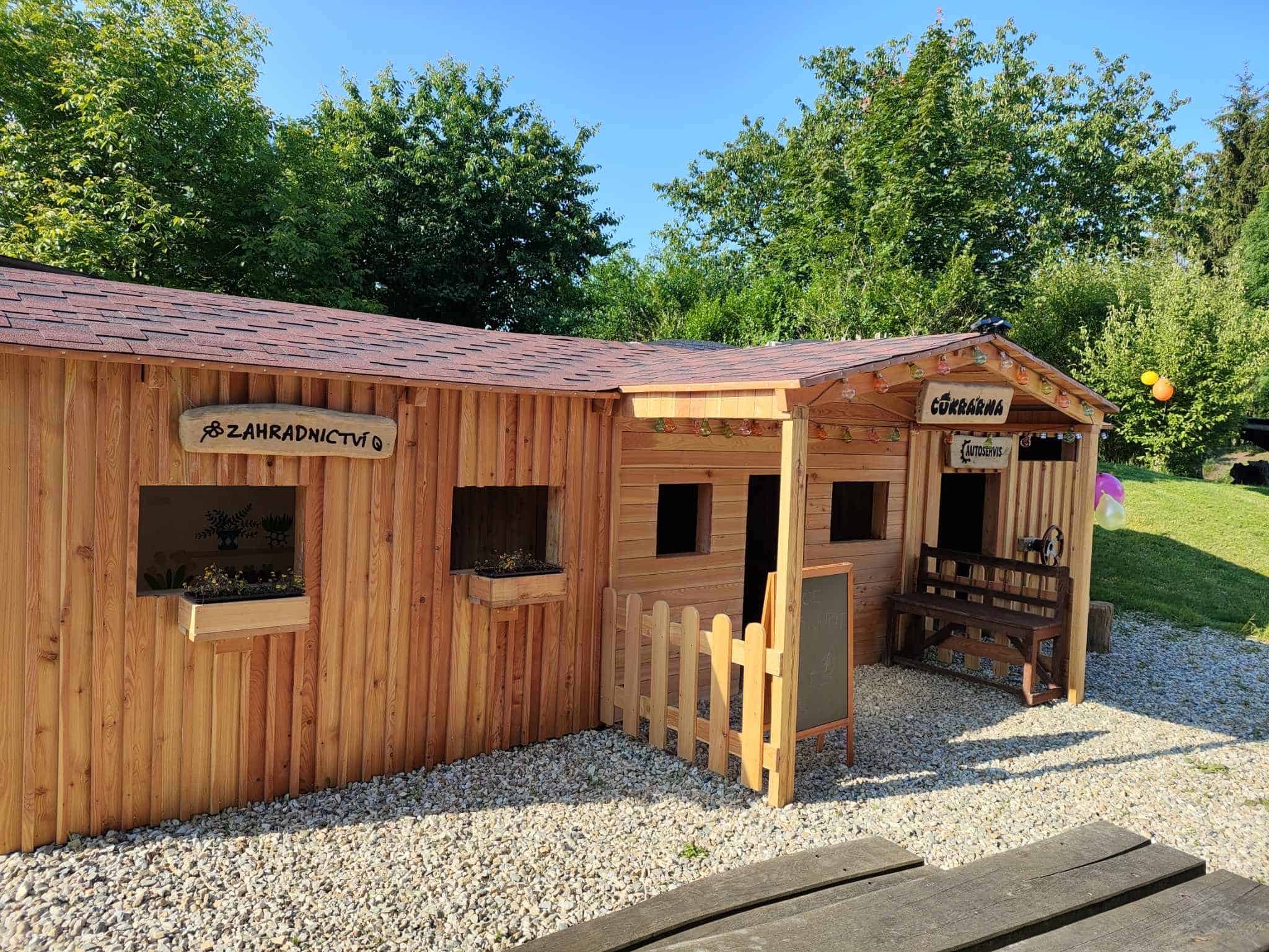 Děti se mohou vyřádit na velikém venkovním hřišti, které nabízí nejen různá pískoviště, prolézačky a skluzavky ale také dřevěnou kuličkovou dráhu, která jistě potěší malé i velké objevitele. Kuličku si doneste svojí nebo ji můžete koupit na místě. Za hezkého počasí jistě oceníte vodní prvky, které děti nejen zabaví, ale také ochladí. Podzemní tunely a bylinková zahrádka jen umocní radost z pobytu v této vesničce.