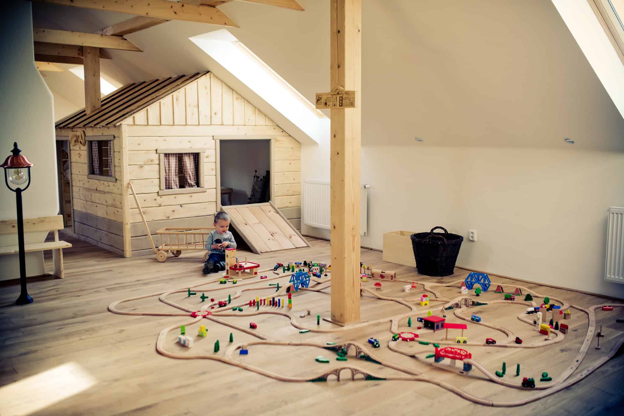 Tato část půdy bude děti opravdu bavit. Vy si můžete hrát s nimi a kdybyste potřebovali zabavit menší plazivce, tak na druhém konci půdy naleznete krásně oplocený prostor pro mrňata – Batolárnu nebo pokojíček pro malé sportovce, v němž využijete různé balanční kameny a desky, veliké kostky na stavění či odrážedla.